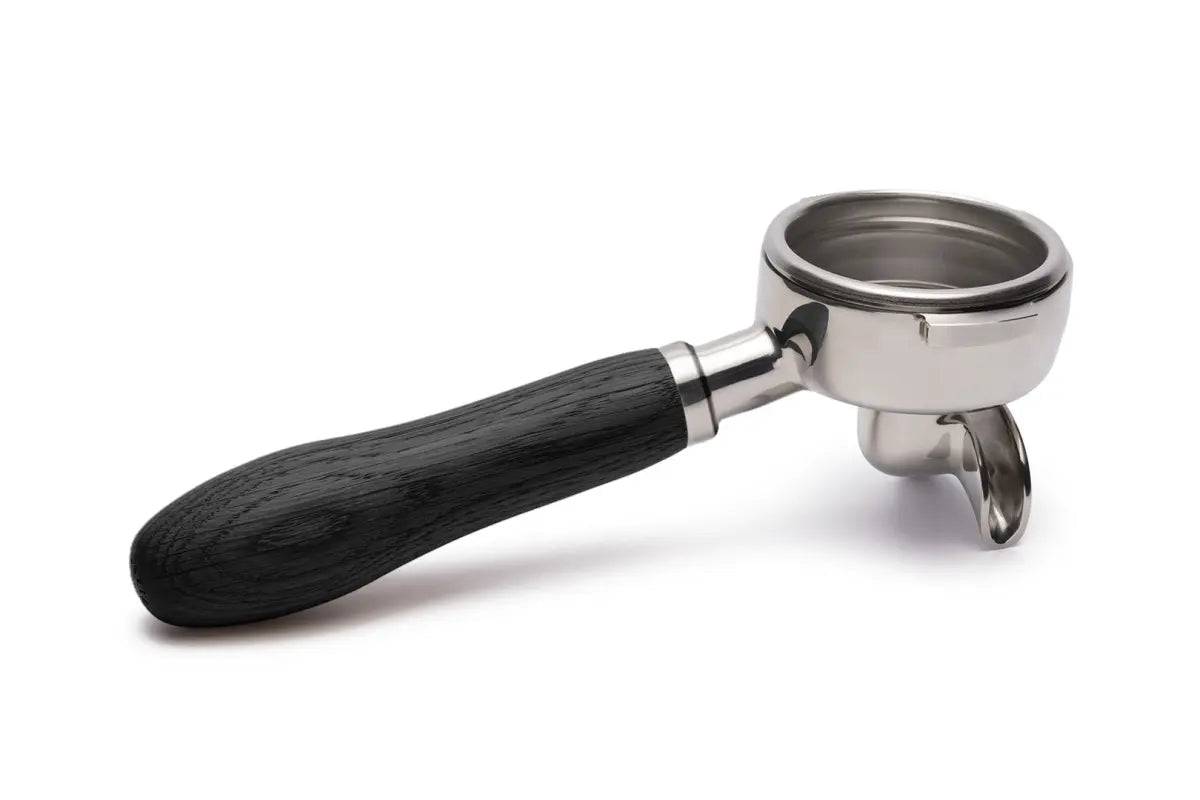 Brewspire Siebträger in 58mm mit Doppelauslauf vorne aus Edelstahl mit Griff aus Echtholz